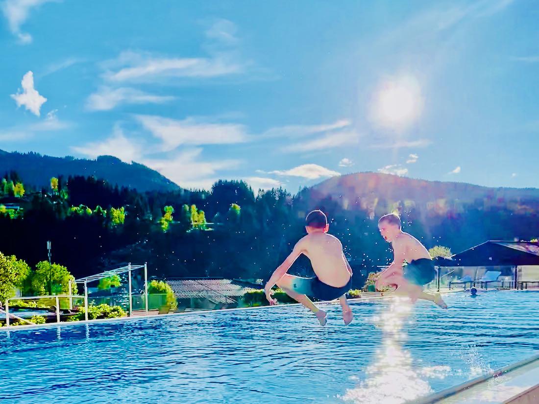 Nach 6 Kilometern wandern erreichten wir den Gipfel der Hohen Salve. Ein wunderbarer Blick über die Alpen bot sich uns. Die Schneebedeckten Gipfel kitzelten die Wolken und es war einfach herrlich hier oben zu stehen und die Aussicht zu genießen. Dort oben gab es dann natürlich einen Kaiserschmarren und Spinatknödel für alle. Das hatten wir uns auch verdient. Hinunter fuhren wir mit der Seilbahn bis zu unserem Hotel. Dies galt es nun zu entdecken. Wir waren im Pool und im 25 Meter-Becken schwimmen. Flo trainierte etwas im Fitnessstudio und den wunderbaren Sauna-Bereich mit Blick auf die Berge nutzen wir auch noch ausgiebig.